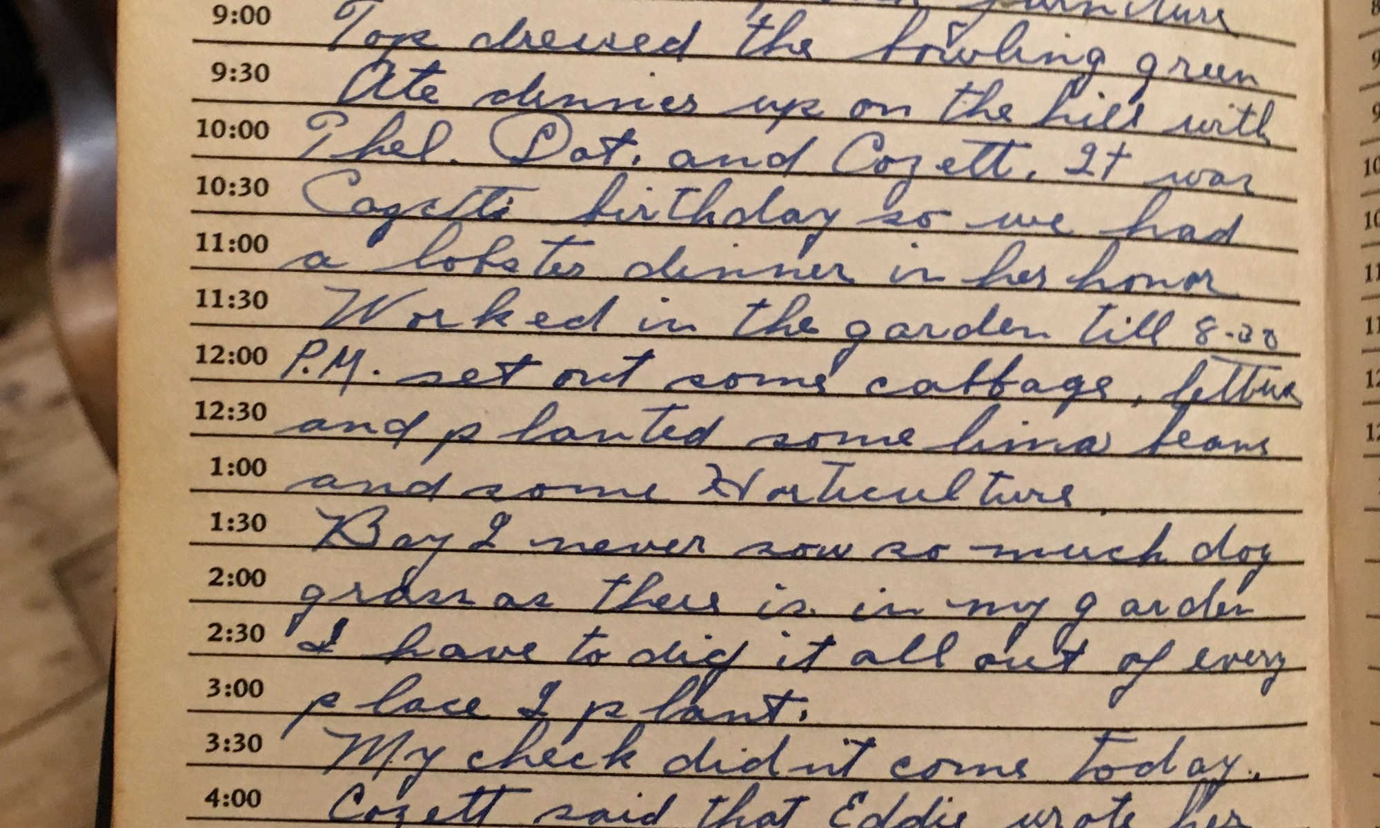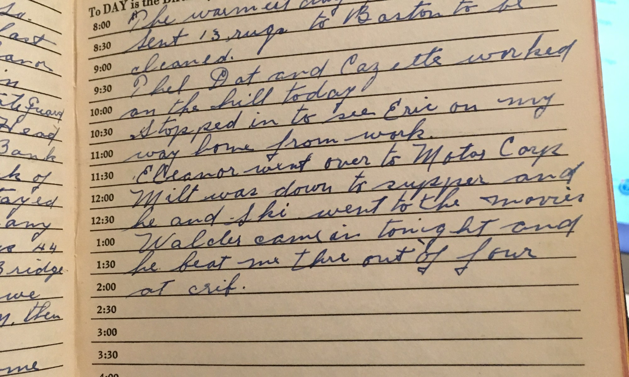 ToDay is the Birthday of The warmest day yet, wind So. Sent 13 rugs to Boston to be cleaned. Thel, Dot, and Cozette worked in the hill today. Stopped in to see Eric on my way home from work. Eleanor went over to Motor Corp. Milt was down to supper and he and Ski went …