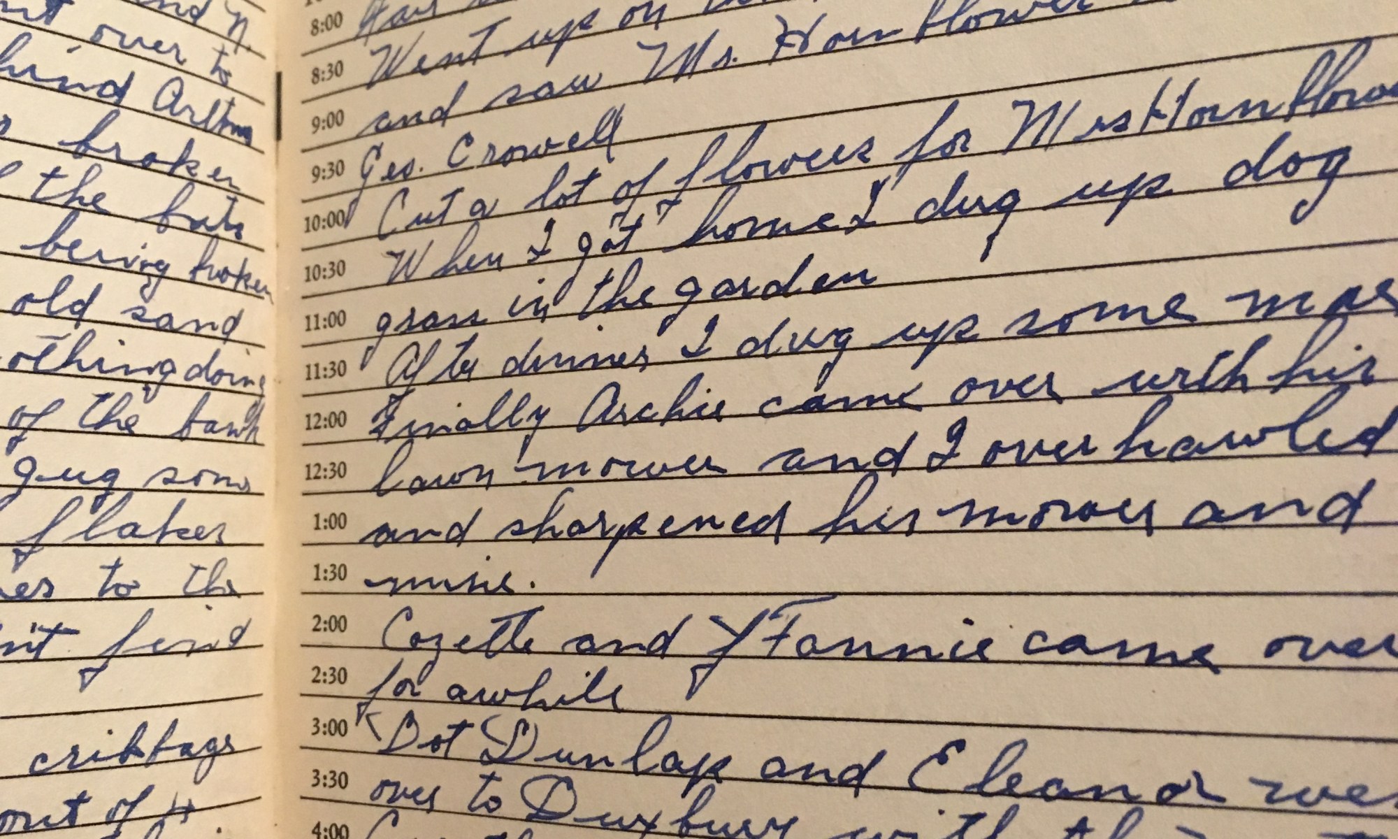 ToDay is the Birthday of Fair and cool wind North. Went up on the hill this morning and saw Mr. Hornblower and Geo. Crowell. Cut a lot of flowers for Mrs. Hornblower. When I got home I dug up dog grass in the garden. After dinner I dug up some more. Finally Archie came over …