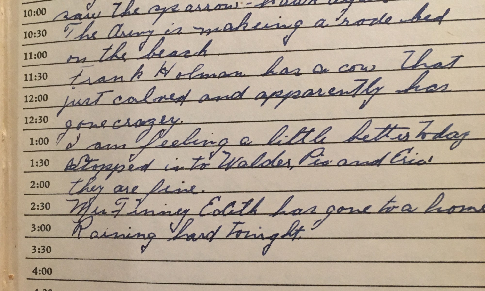 ToDay is the Birthday of Cloud and cold wind East. Cleaned the entrance of the drive on Warren Avenue. Dug some more in the flower gardens, saw the sparrow hawk again. The army is making a road bed on the beach. Frank Holman has a cow that just calved and apparently has gone crazy. I …