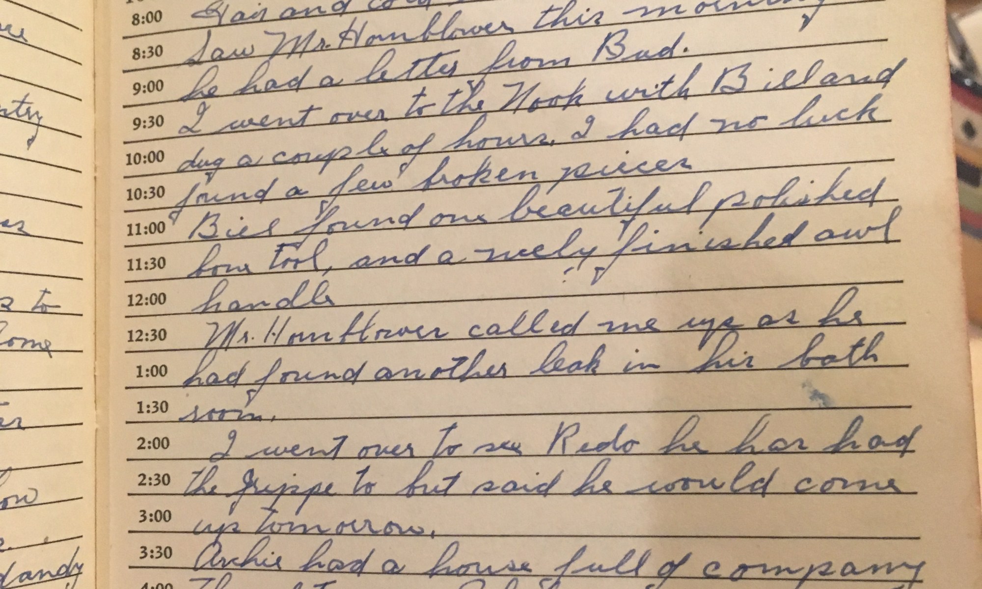 ToDay is the Birthday of ___________ Fair and cold, wind North. Saw Mr. Hornblower this morning, he had a letter from Bud. I went over to the Nook with Bill and dug a couple of hours. I had no luck, found a few broken pieces. Bill found a beautiful polished bow tool, and a nicely …