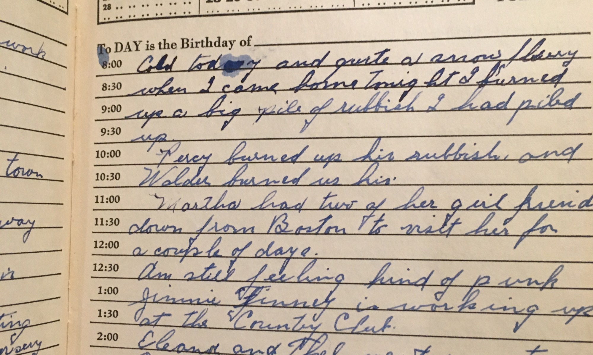 ToDay is the Birthday of ___________ Cold today and quite a snow flying when I came home tonight I burned up a big pile of rubbish I had puled up. Percy burned up his rubbish, and Walder burned his. Martha had two of her girl friends down from Boston to visit her for a couple …