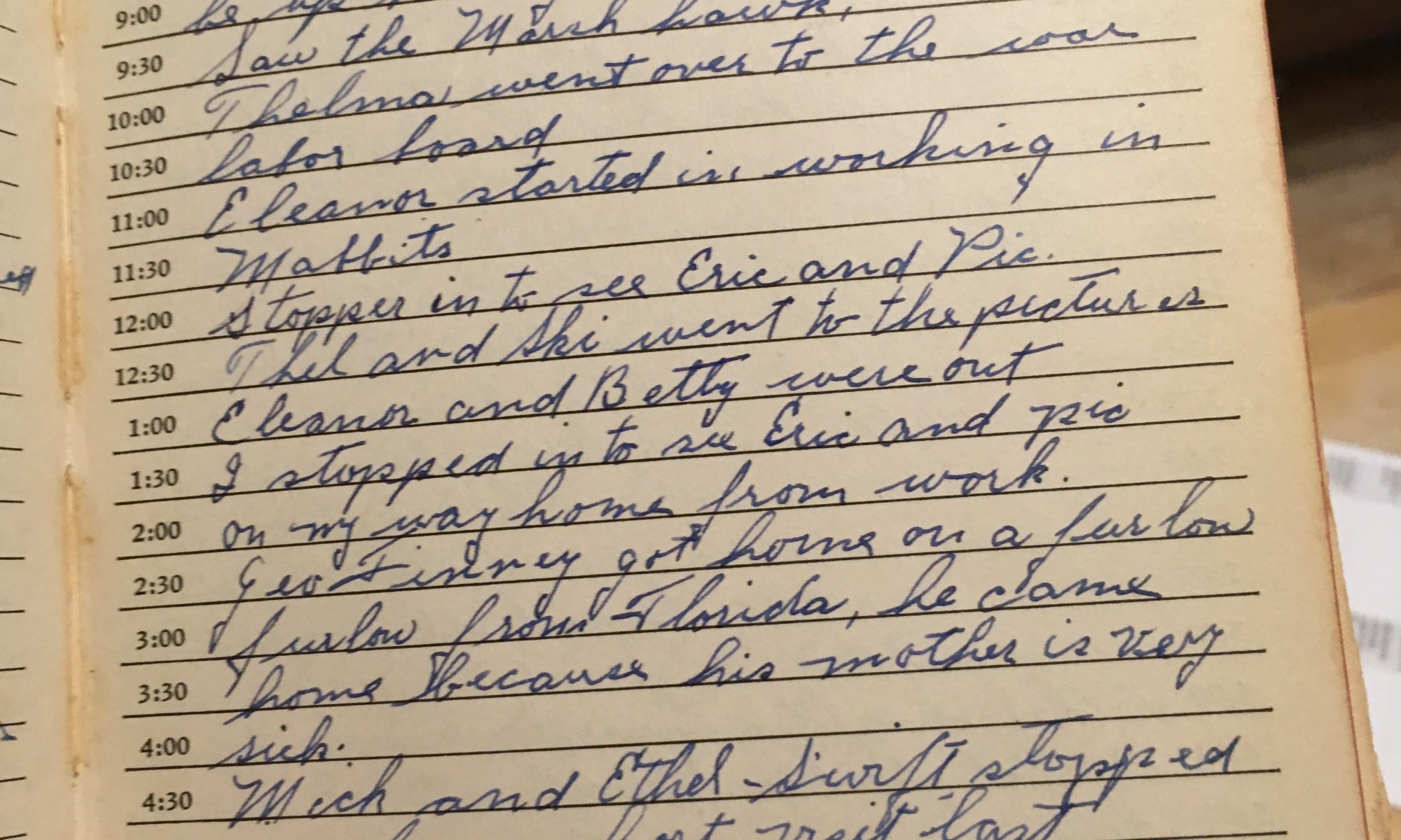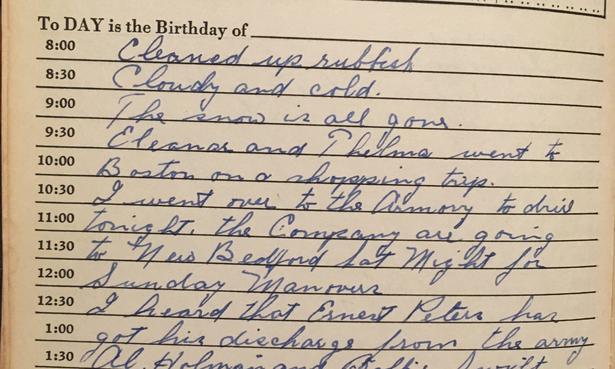 ToDay is the Birthday of ___________ Cleaned up rubbish. Cloudy and cold. The snow is all gone. Eleanor and Thelma went to Boston on a shopping trip. I went over to the Armory to drill tonight. The Comanpy are going to New Bedford Sat night for Sunday maneuvers. I heard that Ernest Peter has his …