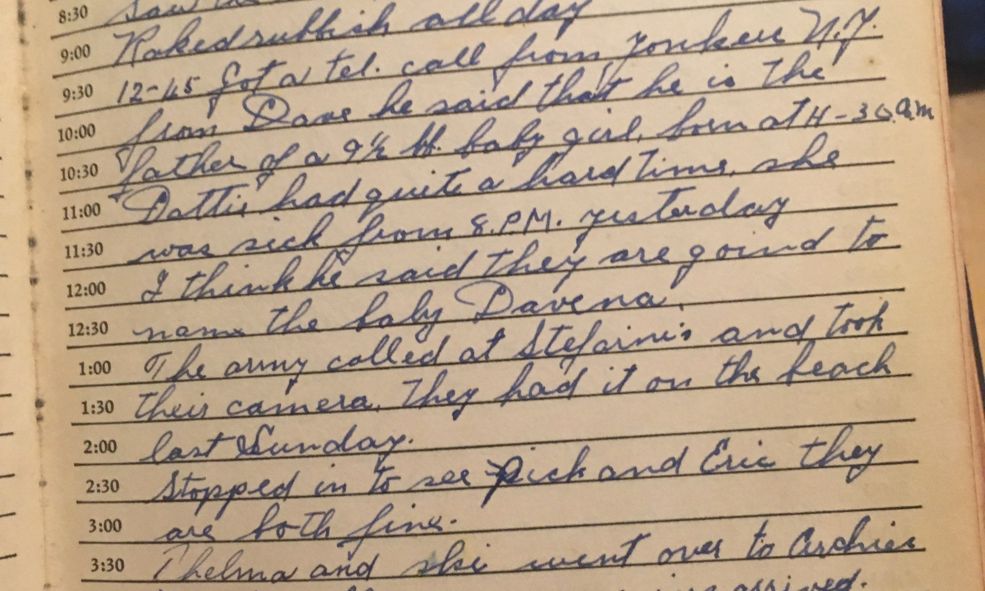 ToDay is the Birthday of Davene Margo Brewer Fair and cool today, wind east. Saw the blimp this morning. Raked rubbish all day. 12:15 got a telephone call from Yonkers N.Y. from Dave and he said he is the father of a 9½ lb. baby girl, from 11-30 am. Dottie had quite a hard …