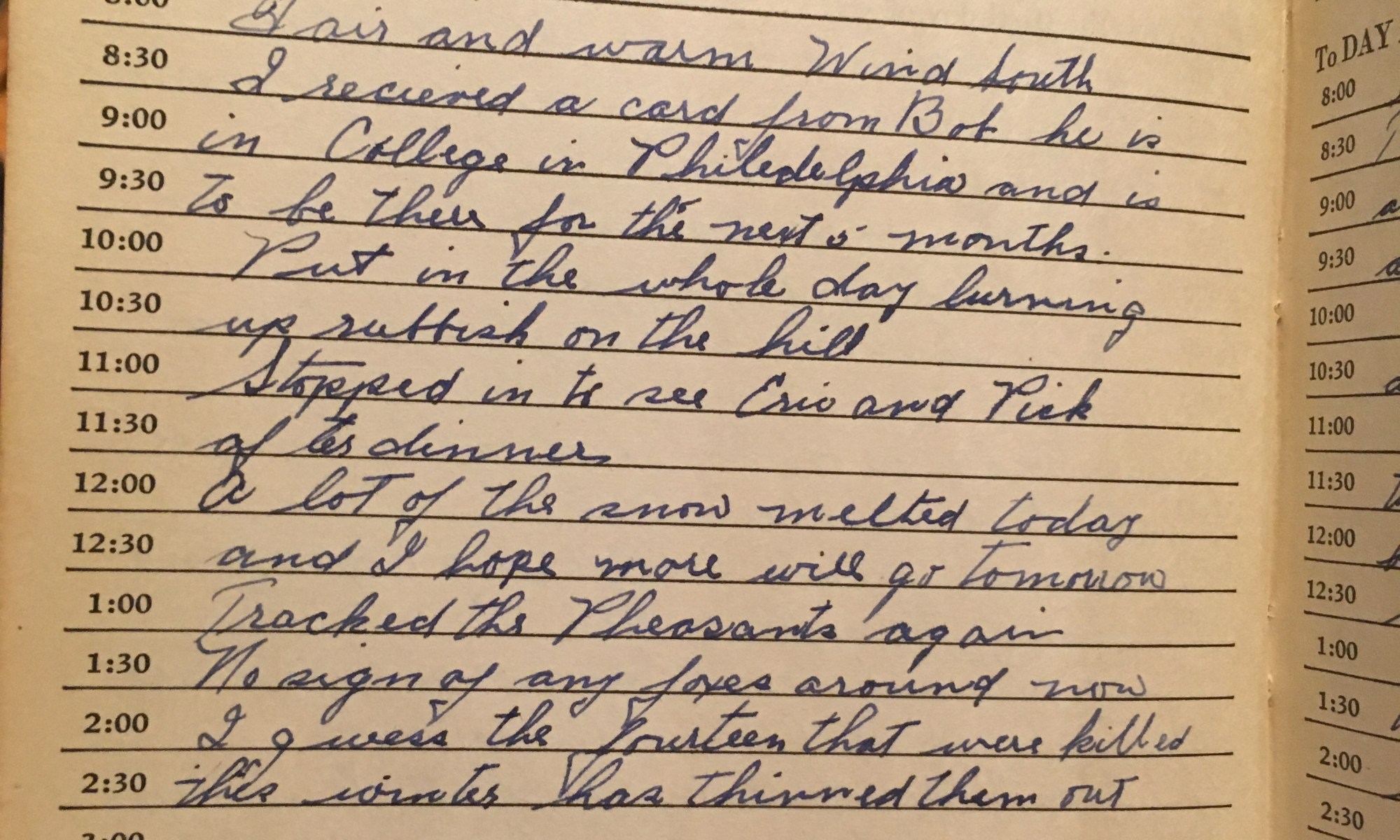 ToDay is the Birthday of ___________ Fair and warm. Wind south. I received a card from Bob. He is in College in Philadelphia and is to be there for the next 5 months. Put in the whole day burning up rubbish on the hill. Stopped in to see Eric and Vick after dinner. A lot …