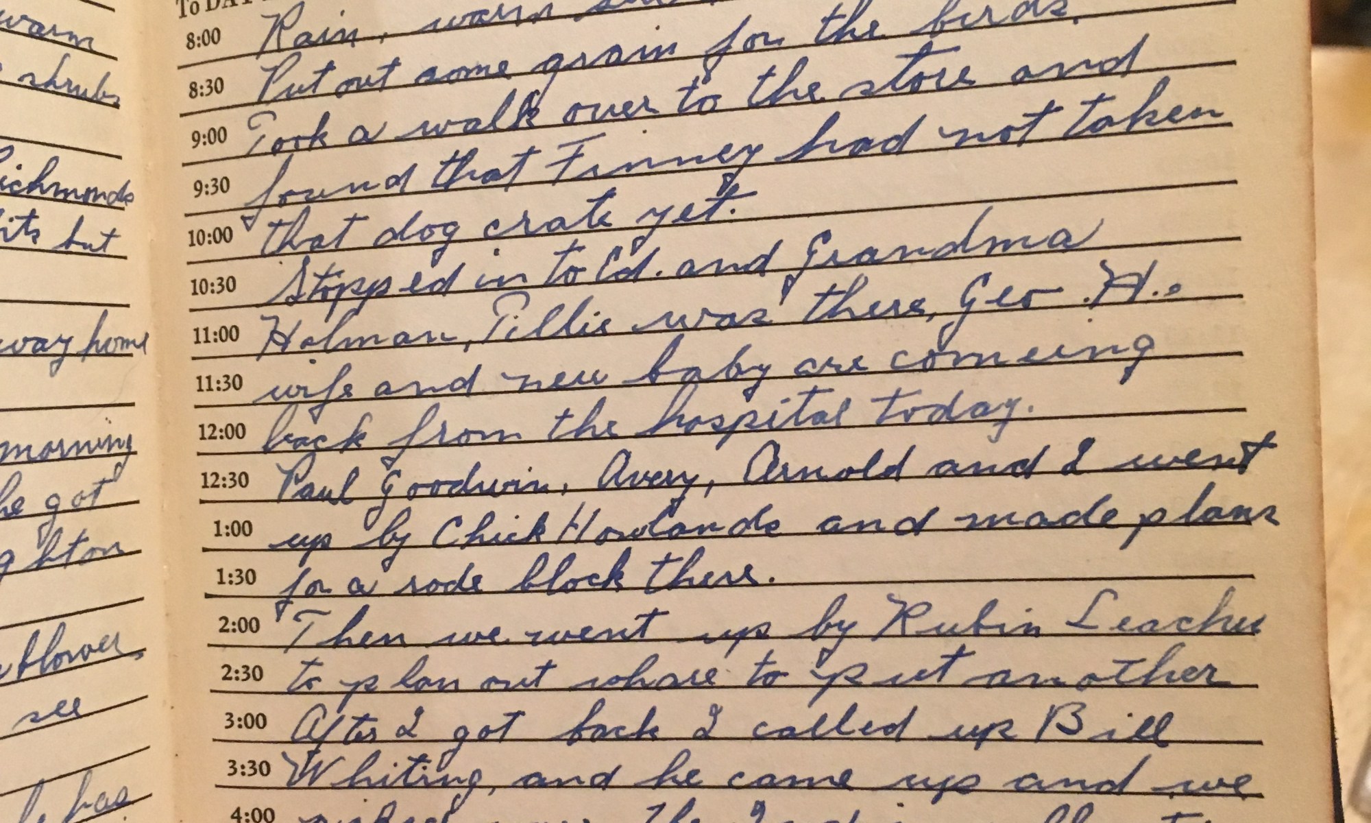 ToDay is the Birthday of ___________ Rain, warm south wind. Put out some grain for the birds. Took a walk over to the store and found that Finney had not taken that dog crate yet. Stopped in to Ed and Grandma Holman, Tillie was there, Geo H.'s wife and new baby are coming back from …
