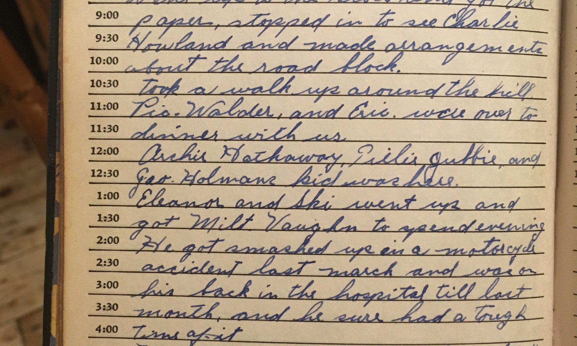 ToDay is the Birthday of ___________ Fair and warm. Went up to the store and got the paper, stopped in to see Charlie Howland and made arrangements about the road block. Took a walk up around the hill. Vic, Walder, and Eric were over to dinner with us. Archie Hathaway, Tillie Gubbie, and Geo. Holman's …
