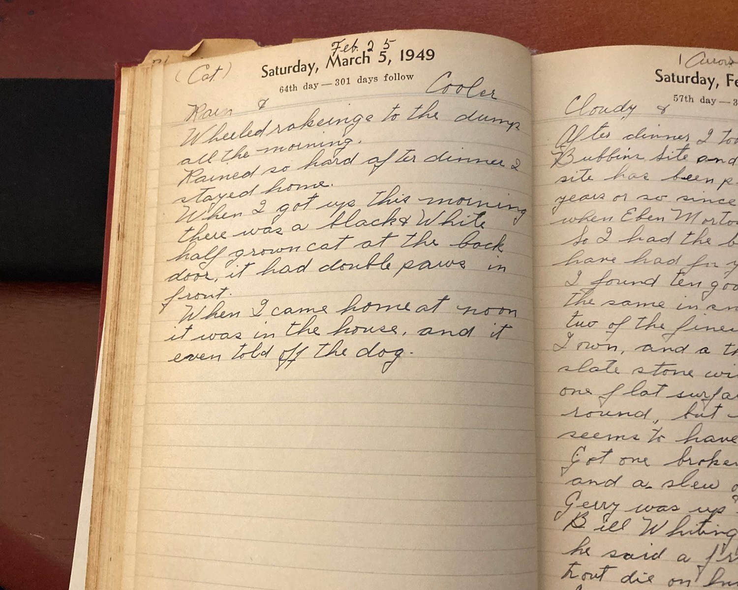 (Cat) Rain + Cooler Wheeled rankings to the dump all the morning. Rained so hard after dinner I stayed home. When I got up this morning there was a black + white half grown cat at the back door. It had double paws in front. When I came home at noon it was in the …