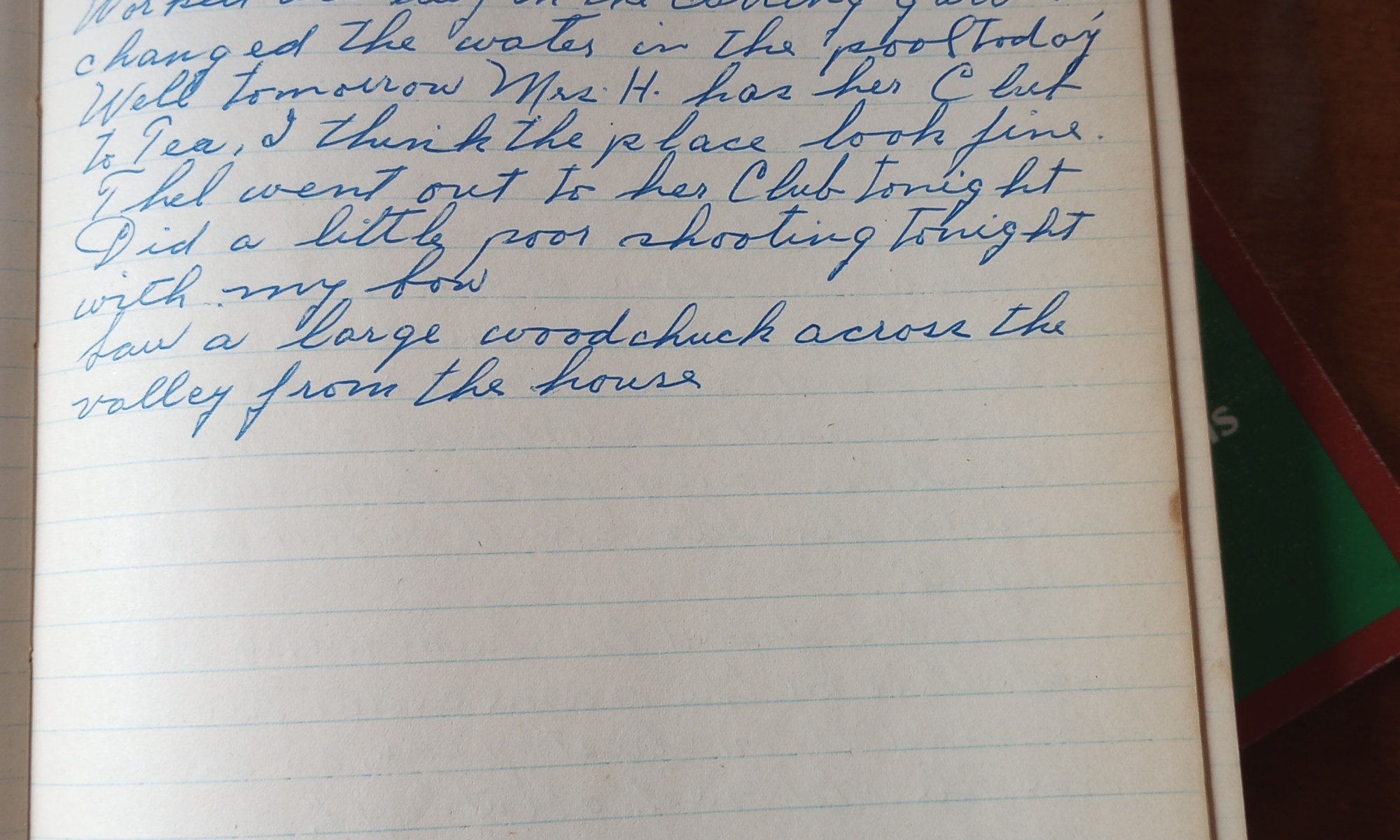 147th day- 219 days follow Cloudy and light showers I saw a rabbit and a pair of quail on the cutting garden today. Worked all day in the cutting garden. Changed the water in the pool today. Well, tomorrow Mrs. H. has her Club to tea. I think the place looks fine. Thel went out …