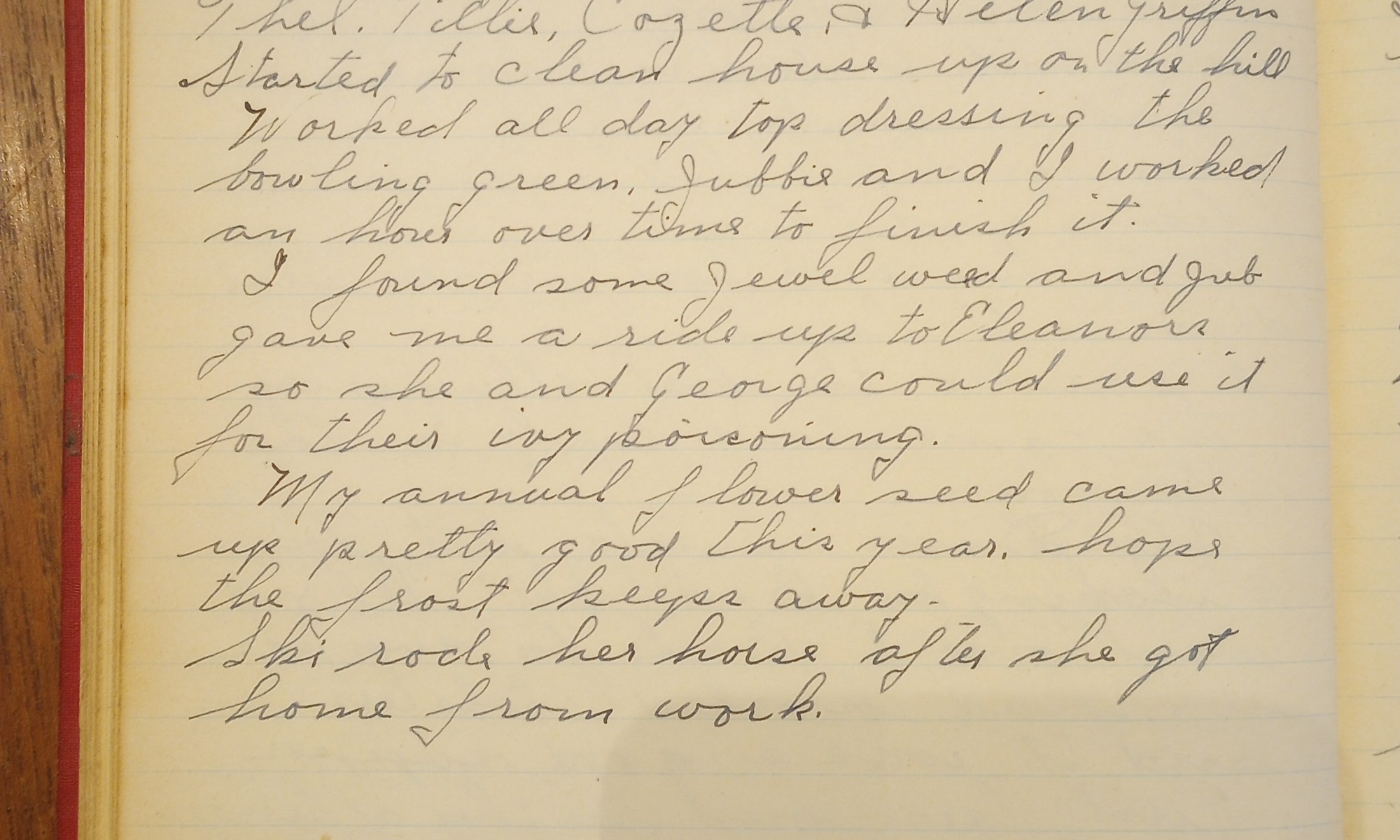 124th day- 242 days follow Partly Cloudy + Warmer Thel, Tillie, Cozette, + Helen Griffin started to clean house up on the hill. Worked all day top dressing the bowling green. Jubbie and I worked an hour over time to finish it. I found some jewel weed and Jub gave me a ride up to …