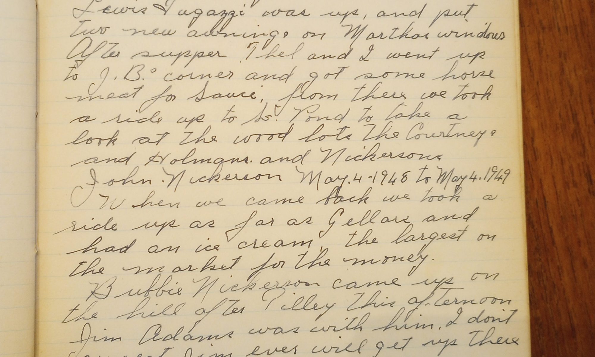 125th day- 241 days follow Fair + Warmer I worked all day painting lawn furniture. The women were up on the hill housecleaning. Lewis Fugazzi was up and put two new awnings on Martha’s windows. After supper Thel and I went up to J.B.’s corner and got some horse meat for Sauci, from there we …