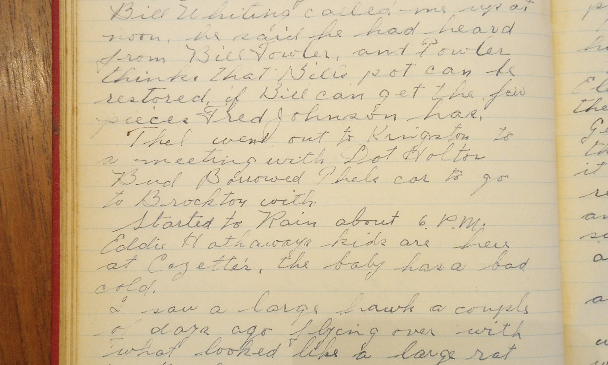 126th day- 240 days follow Partly Cloudy Warmer Painted lawn furniture. The four women were up on the hill cleaning. Bill Whiting called me up at noon. He said he had heard from Bill Fowler, and Fowler thinks that Bill’s pot can be restored if Bill can get the few pieces Fred Johnson has. Thel …