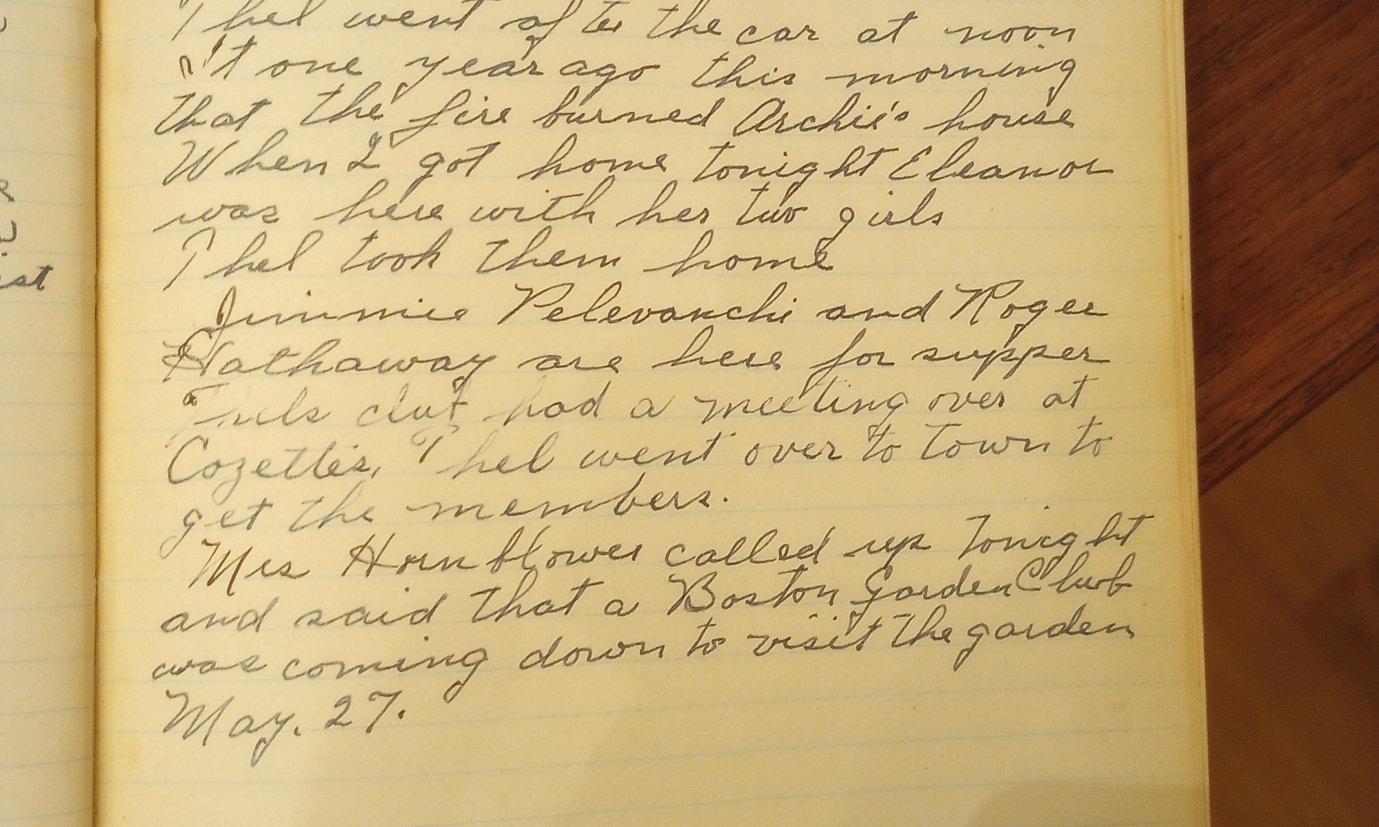 Snow Squalls + Cloudy The Whipple’s plowed out my driveways today. Had to dig out the garage doorway down at Manter’s. Thel went after the car at noon. It [was] one year ago this morning that the fire burned Archie’s house. When I got home tonight Eleanor was here with her two girls. Thel took …