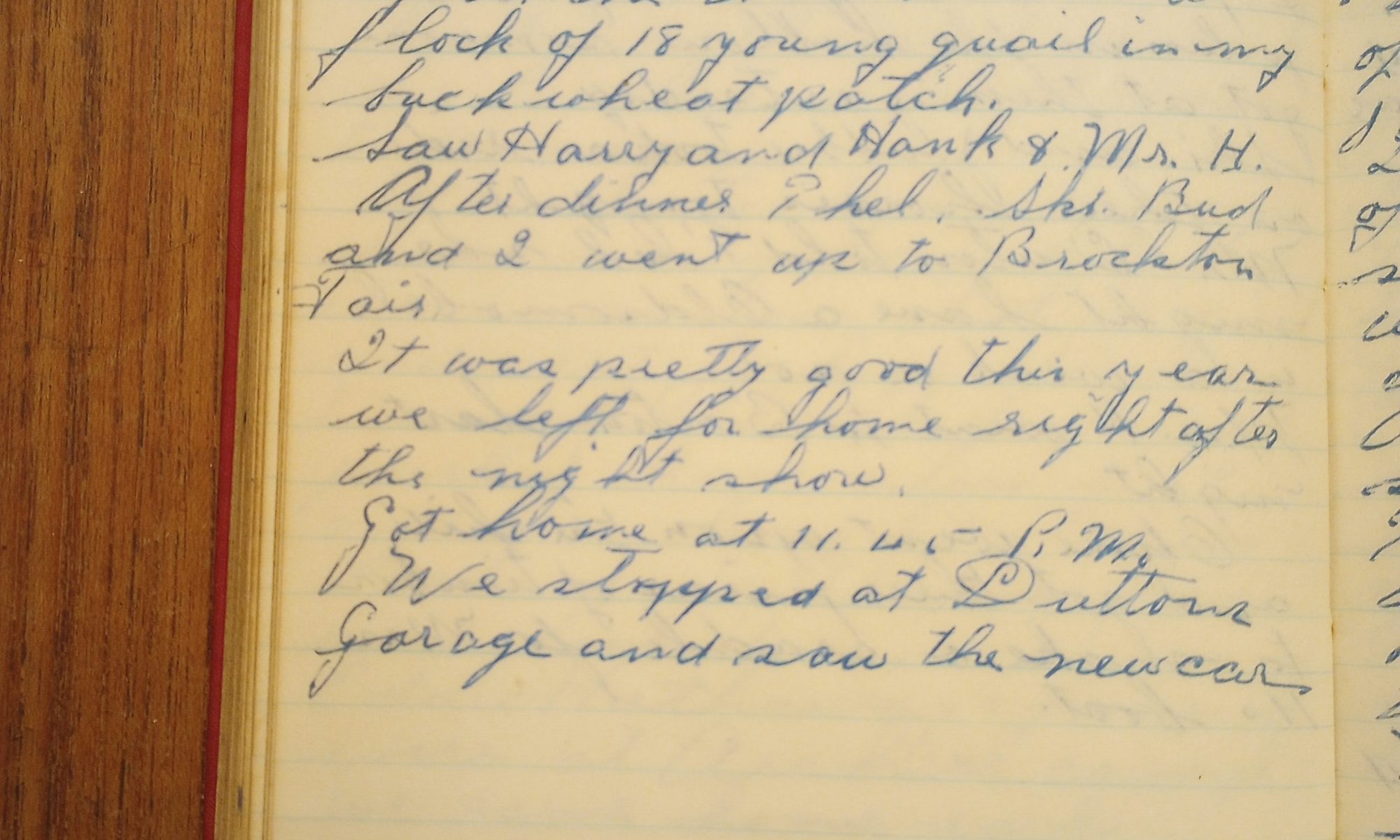 252nd day- 113 days follow Fair + Cooler This morning when I went up on the [hill] there was a flock of 18 young quail in my buckwheat patch. Saw Harry and Hank and Mr. H. After dinner Thel, Ski, Bud and I went up to Brockton Fair. It was pretty good this year. We …